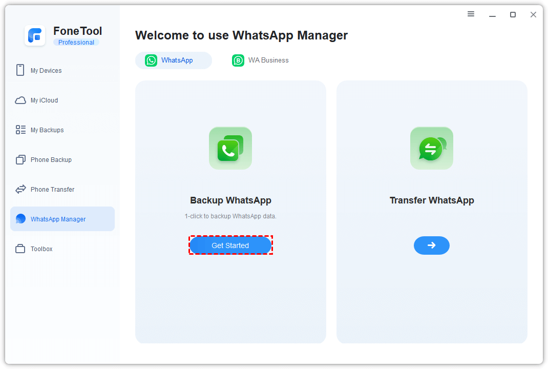 Step 2. Launch FoneTool > Navigate to WhatsApp Manager > Select Backup WhatsApp > Click Get Started.