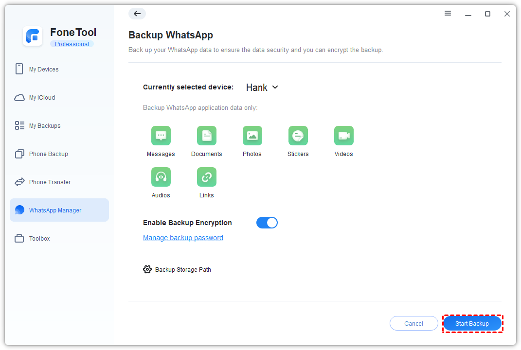 Step 3. Enable Backup Encryption for privacy > Choose backup location > Click Start Backup.