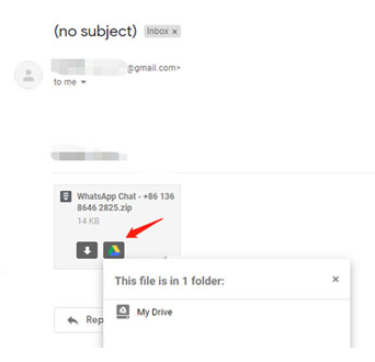 Check the email on iPhone or computer > Select the chat and then choose the Google Drive icon to save WhatsApp to Google Drive. (Make sure you have downloaded Google Drive on your device.)