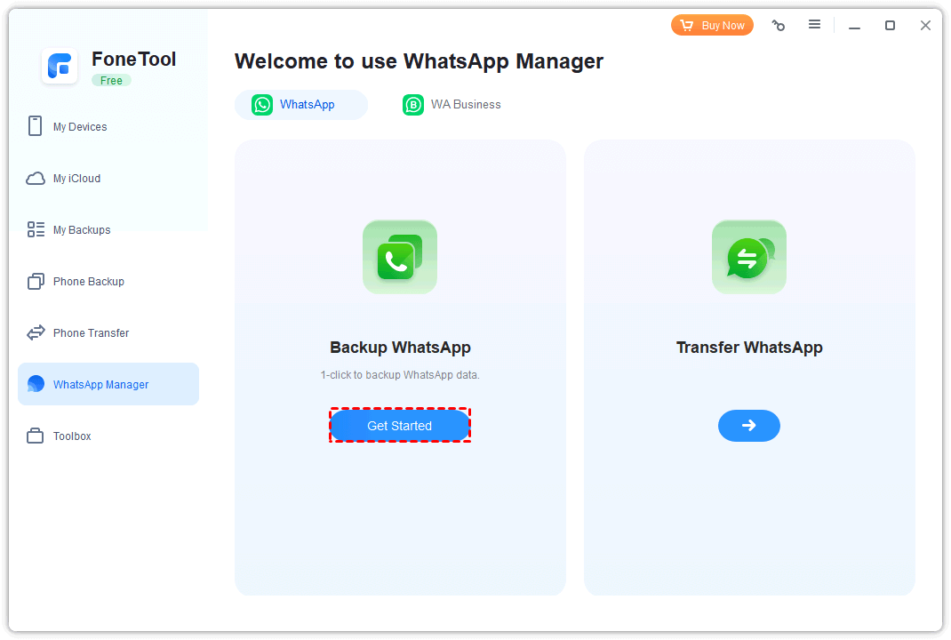 Step 1. Choose WhatsApp Manager from the homepage of FoneTool > Backup WhatsApp > Click Get Started.