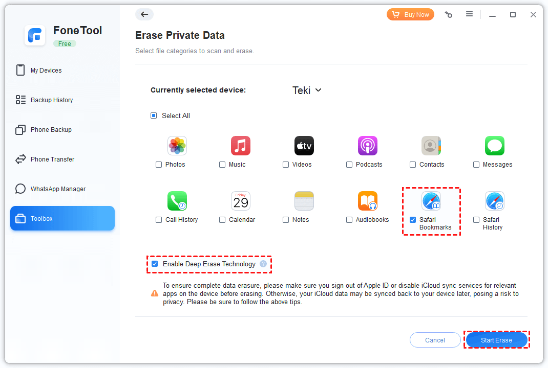 FoneTool is a professional iPhone data management tool that provides a Privacy Erasure feature specifically designed to permanently delete bookmarks and other unwanted files from your iPhone.