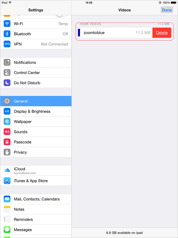 >> For iPad running iPadOS 8: Settings > General > Usage > Manage Storage > Videos. Locate the videos/movies you want to delete, swipe it to left, and then tap the red Delete button to remove.