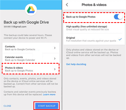 Step 4. Choose Photos & videos and enable it > Back to the Backup page, and click START BACKUP to start backup WhatsApp photos and videos to Google Drive.