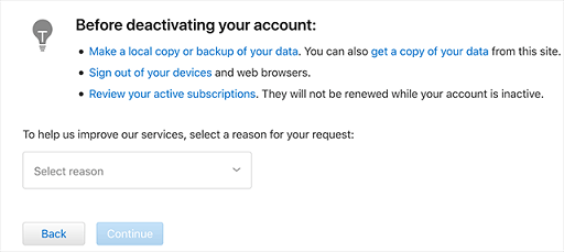 Step 3. Please read carefully what happens to your services and data when you deactivate your account. After that, click on Select reason dropdown at the bottom, select why you are deactivating your account, and click on Continue.