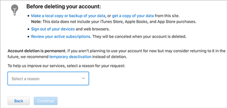 Step 3. You will be asked to read the consequences of deleting your account > You can click Select a reason dropdown menu, choose the reason why you are deleting your account, and click on the Continue button.