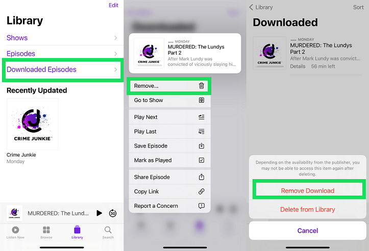 Open the Podcasts app > Tap Library > Choose Downloaded Episodes > Long-press the episode you’d like to delete > Tap Remove... > Tap Remove Download.