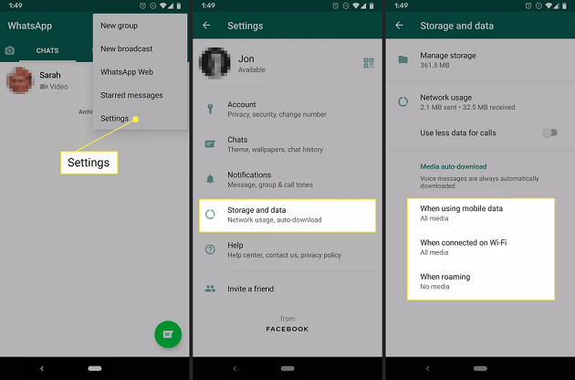 Step 1. On your Android phone, open WhatsApp > tap the three-dot icon > Settings > Storage and data.