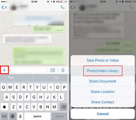 Step 1. Go to a WhatsApp conversation, and tap plus icon > Choose Photo/Video Library.