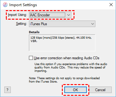Step 1: In iTunes menu, select Edit > Preferences > Import Settings> AAC Encoder in the Import Using and Click OK.