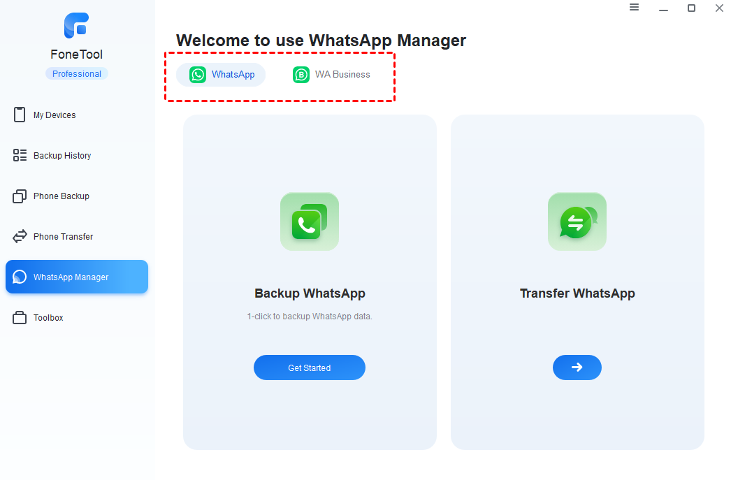 Step 2. Go to WhatsApp Manager > Backup WhatsApp > Get Started.