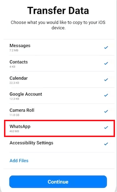 Step 3. On your Android phone, enter the code > Tap Continue and follow the on-screen prompts > Select WhatsApp on the Transfer Data screen. You can also transfer other wanted files from this page to transfer to iPhone.