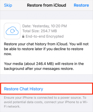 Step 4. It will automatically detect the presence of a backup file > Then tap Restore Chat History and wait for the process to complete.