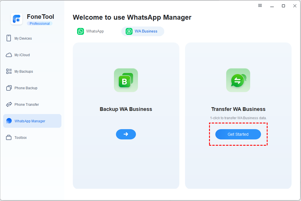 Step 2. Choose WhatsApp Manager > Go to WA Business > choose Transfer WA Business and click Get Started.
