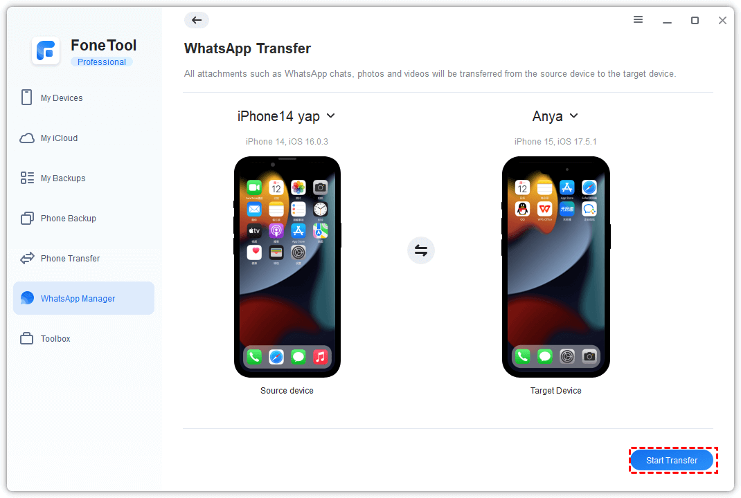 Well, if you want to transfer everything including WhatsApp to new iPhone in one click, you can use FoneTool, one professional iPhone data management tool. Its iPhone to iPhone Transfer feature can help you transfer WhatsApp as well as photos, videos, messages, contacts, music, app data, call history, system settings, etc.