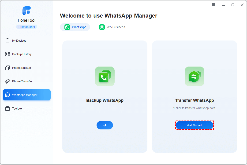 Step 2. Launch FoneTool and go to WhatsApp Manager → Transfer WhatsApp → Get Started.