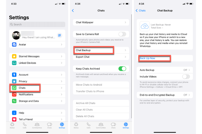 iPhone: Settings → Chats → Chat backup → Back Up Now