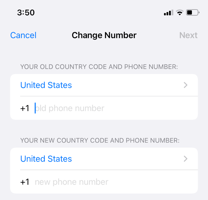 Step 2. Tap Next and enter both your old and new phone numbers.