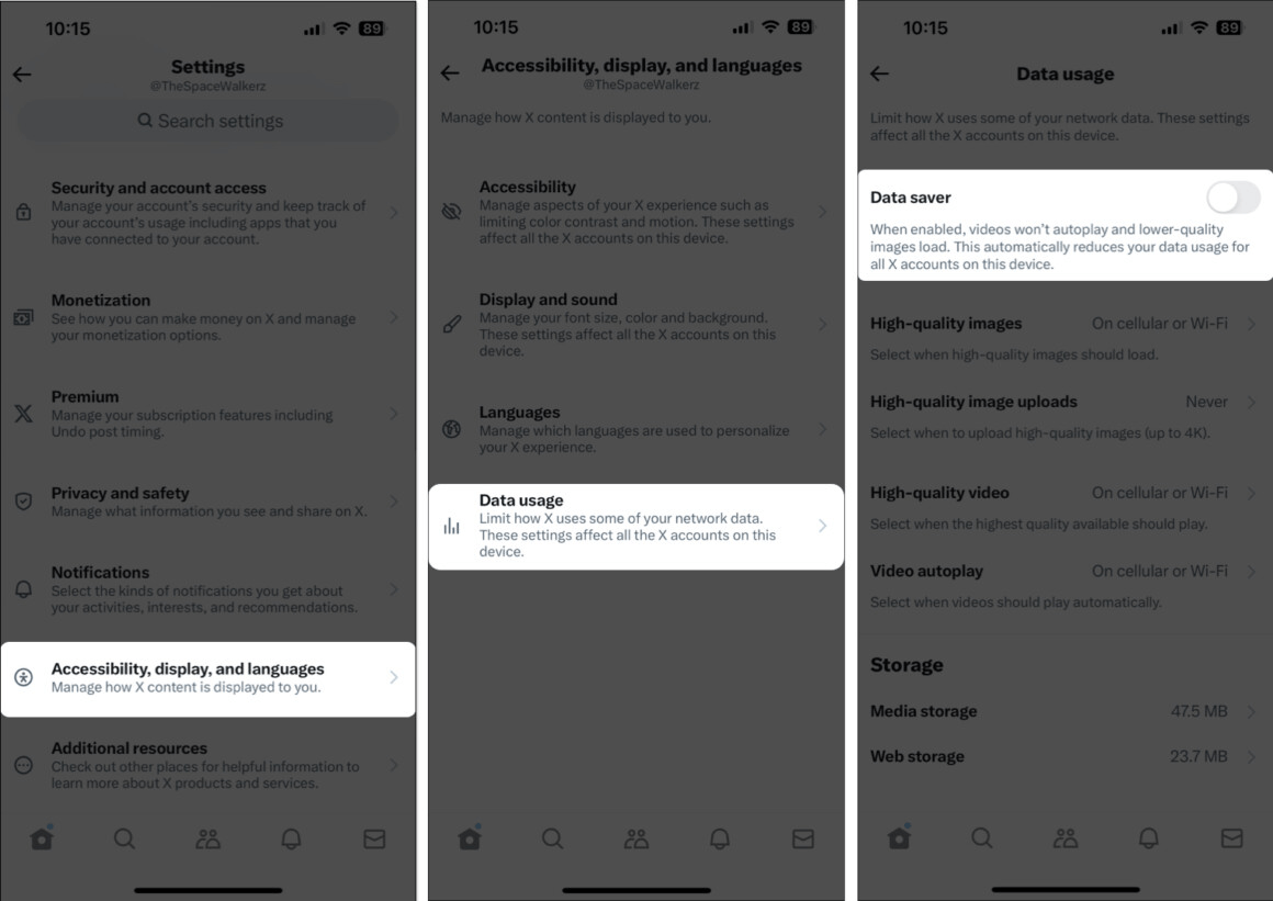 Twitter's Data Saver feature is designed to reduce data consumption. Yet, at times, this feature might block certain items from loading on your feed. Consider turning off this feature to check if it resolves the issue.