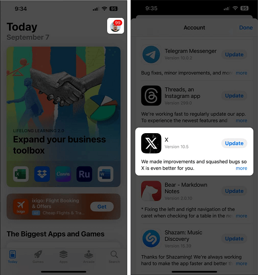 Open the App Store app > Tap your profile picture in the top right corner > Scroll down and check if an update for Twitter (X) is available.