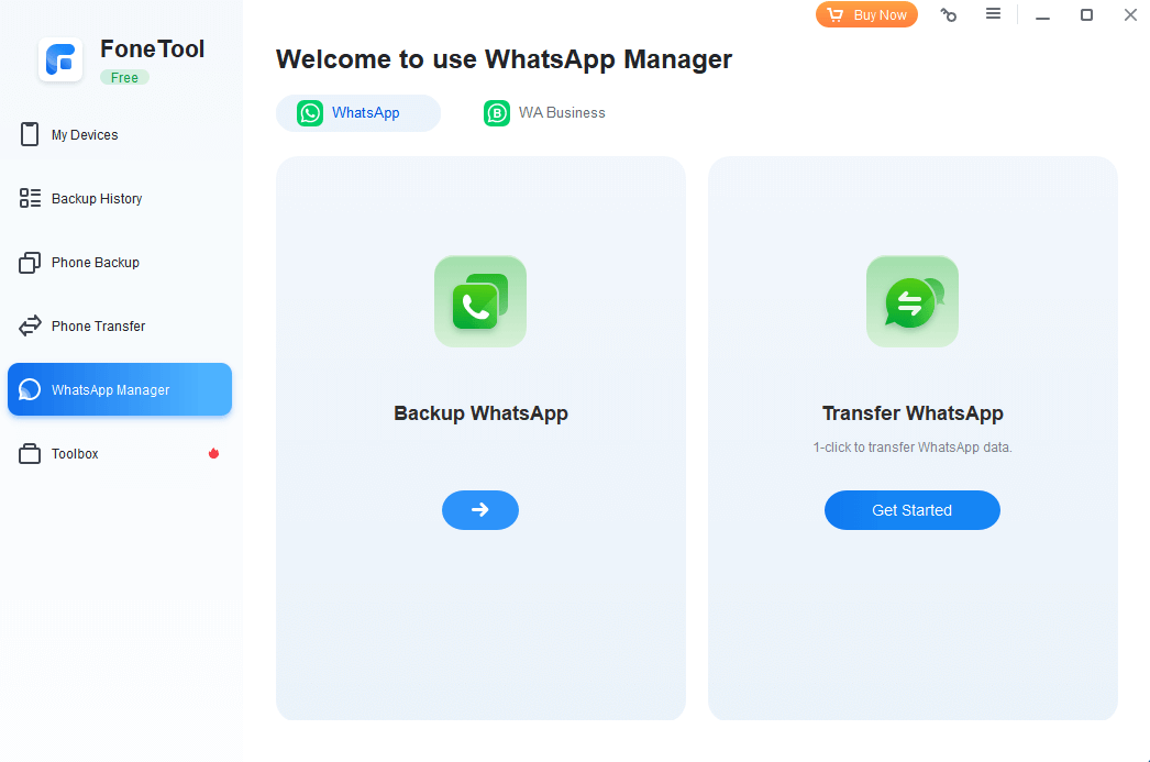 Step 2: After FoneTool recognizes your devices, select WhatsApp Manager on the home page. Then, choose WhatsApp Transfer and click Get Started.