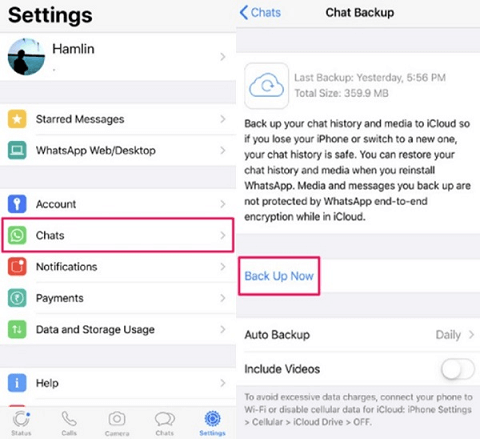 Step 2. Open WhatsApp on your iPhone > go to its Settings > Tap Chats > Chat Backup. From here, you can choose Back Up Now to backup WhatsApp immediately.