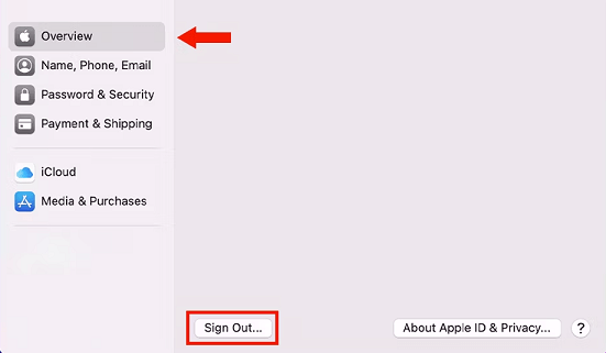 Go to Apple menu > System Settings > Click Apple ID > Choose Overview from the prompt window > Click Sign Out...