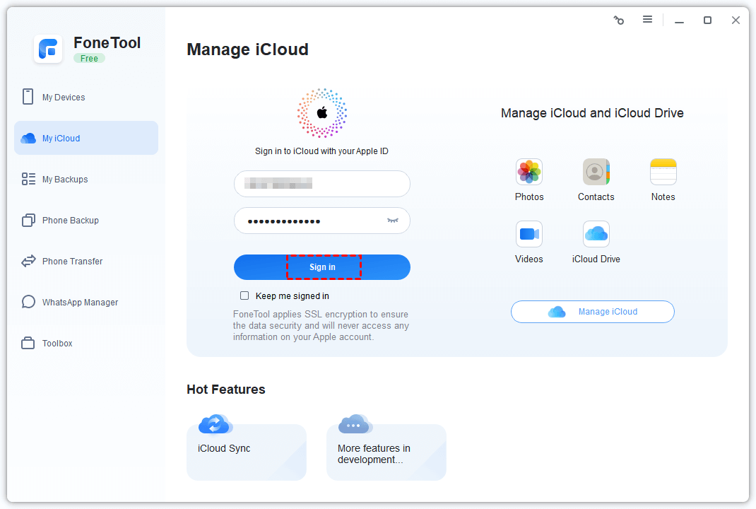 Step 2. Choose My iCloud on the homepage of FoneTool. Sign in with your iCloud account. You will be asked to enter the verification code to confirm your operation.