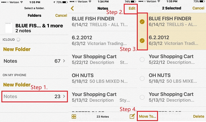 Step 2. Select the notes you want to move (you can select all by clicking Move All or swipe left on an individual note to select only one) > Tap Move To and choose a folder under iCloud to relocate your selected notes.