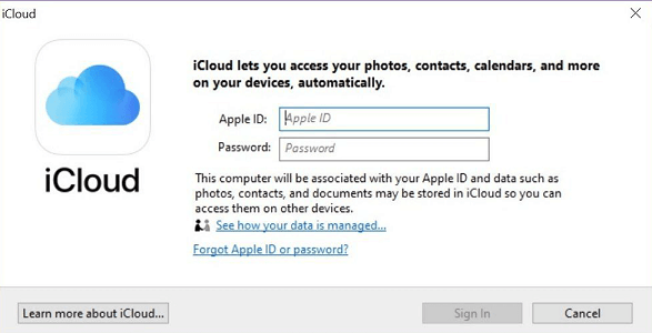 • When prompted, enter your Apple ID and password to sign in iCloud for Windows.