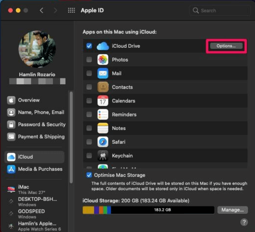 Step 2. Head over to iCloud section from the left pane > Make sure you’ve checked the iCloud Drive option > Click on Options... to proceed further.