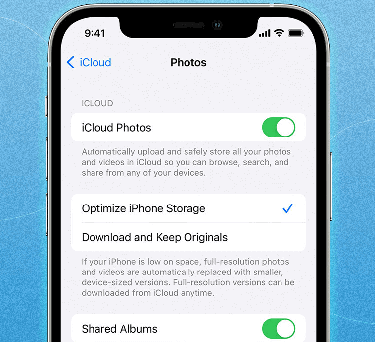 Verify if your iCloud Photos Library and Shared Albums options are activated to ensure the iCloud link functions properly.
