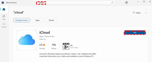 Step 3: Open Microsoft Store, search for iCloud, and click Get to download the app.