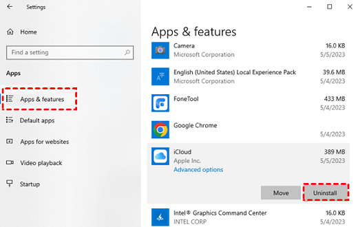 Step 2: Under the Apps & features section, find the iCloud app and click the Uninstall button.