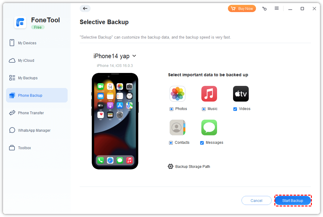 Step 4: After selecting the content to be backed up, click the Start Backup button to back up your iPhone.