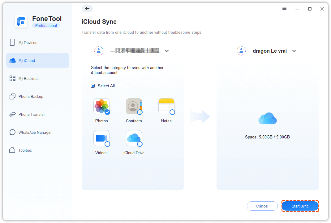 To mass transfer iCloud photos to another account, you can use the professional iCloud manager - FoneTool to help you speed up the process. With its powerful features, you can sync iCloud data in one click.