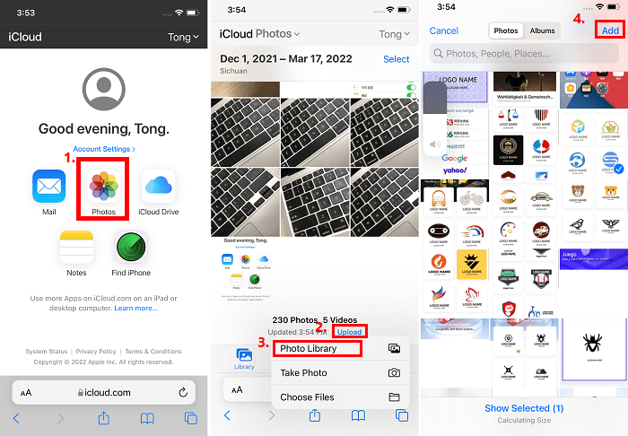 Step 2. Click Photos from the interface > Select Upload > Photo Library.