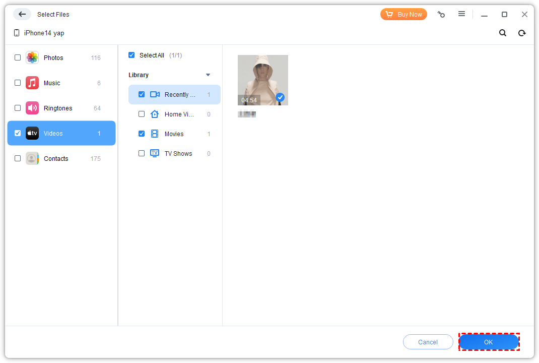 Step 2. Check the Videos icon or Photos icon to preview the videos > Select the specific items you need > Tap OK to continue.