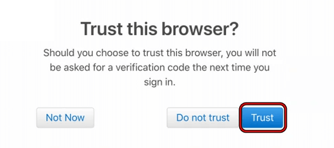 To resolve the problem, sign in to the iCloud website and when asked, select Trust to trust this browser.