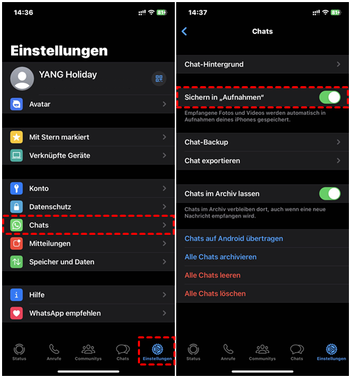 Wenn Sie dennoch ein Backup von WhatsApp in Google Drive auf dem iPhone erstellen möchten, können Sie WhatsApp-Fotos und -Videos zunächst auf dem iPhone speichern und dann ein Backup in Google Drive erstellen.