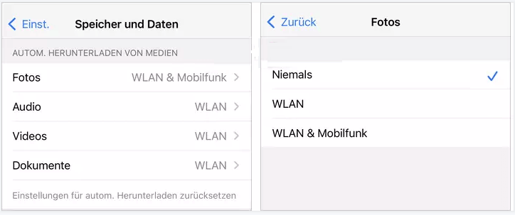 Gehen Sie einfach zu den Einstellungen von WhatsApp auf dem iPhone > Wählen Sie Speicher und Daten > Fotos > Wählen Sie Niemals.