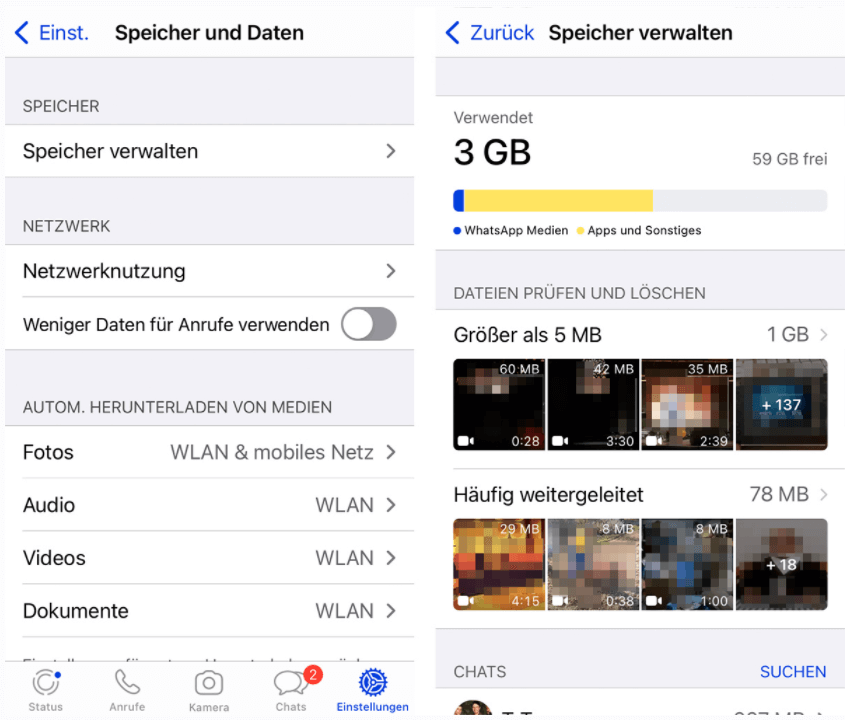 Schritt 1. Gehen Sie auf Ihrem iPhone zu WhatsApp > Gehen Sie zu: Einstellungen > Speicher und Daten > Speicher verwalten.