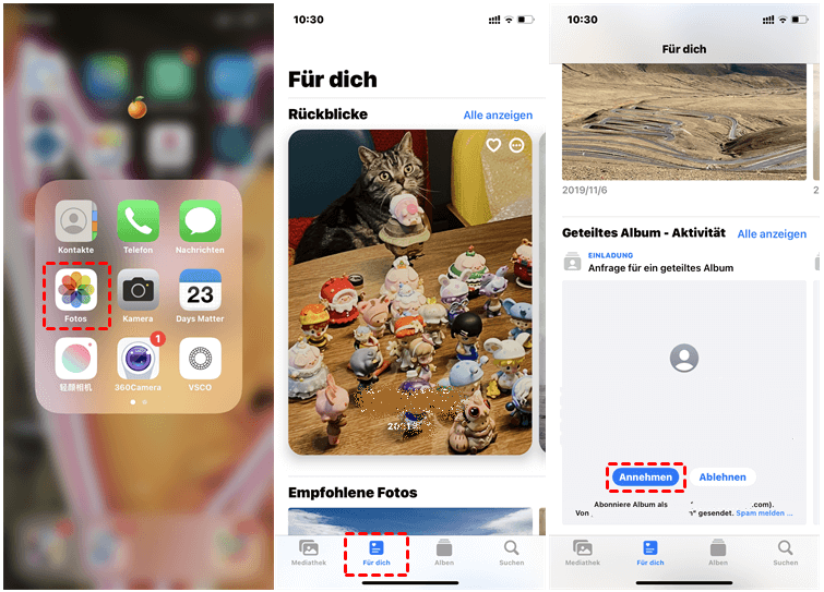 Bevor Sie Fotos und Videos aus einem geteilten Album auf das iPhone laden, müssen Sie die Einladung zum geteilten Album annehmen. Gehen Sie zu Ihrer Fotos-App > Klicken Sie auf „Für Dich“. Die Einladung wird oben in der Liste angezeigt > Tippen Sie auf „Annehmen“.