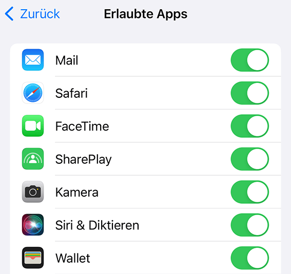 Sie können dies manuell überprüfen: Öffnen Sie die App „Einstellungen“ auf Ihrem iPhone > Tippen Sie auf „Bildschirmzeit“ und geben Ihren Passcode ein, wenn Sie dazu aufgefordert werden > Wählen Sie „Inhalts- und Datenschutzbeschränkungen“ > „erlaubte Apps“ > Stellen Sie sicher, dass der Kippschalter neben „Kamera“ aktiviert ist (in der Position „EIN“). Wenn die Kameraoption in „Bildschirmzeit“ deaktiviert war, schalten Sie sie ein.