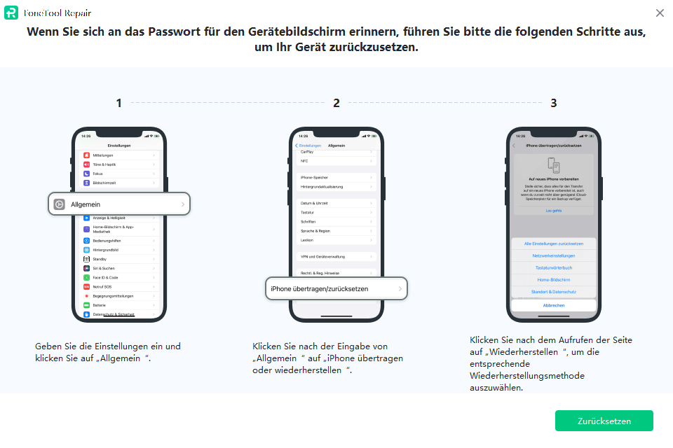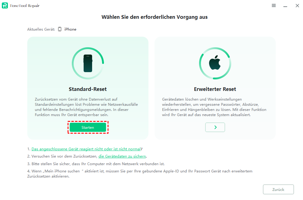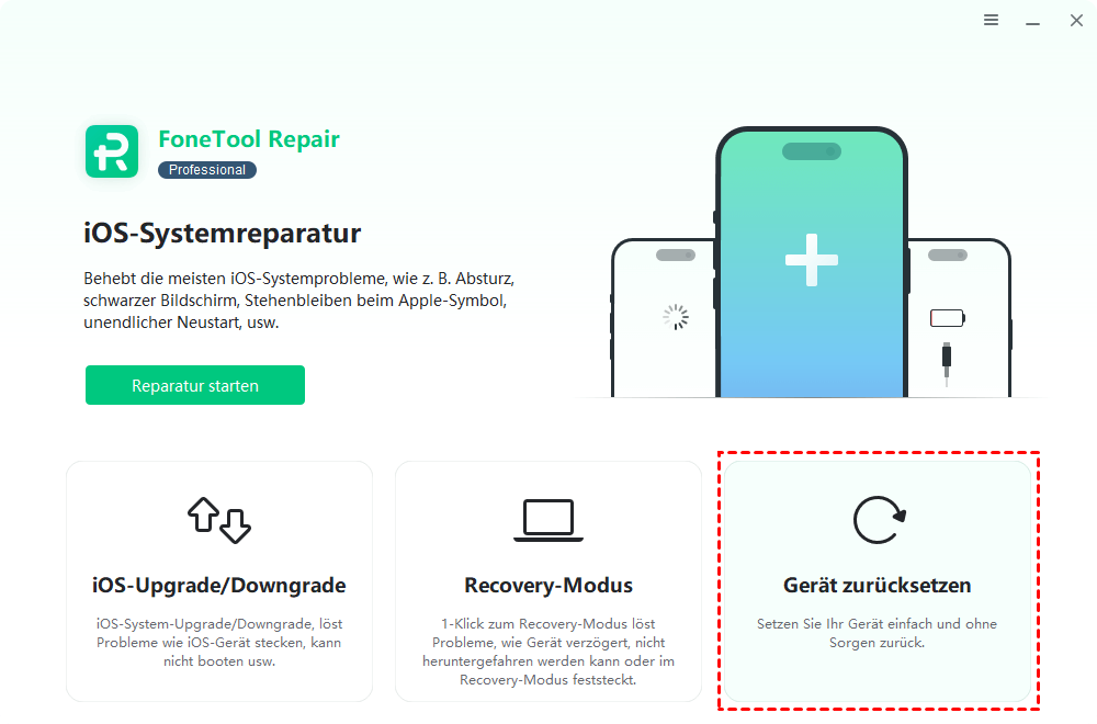 Sollten die bisherigen Methoden nicht den gewünschten Erfolg bringen, könnte ein Zurücksetzen auf die Werkseinstellungen die sinnvollste Lösung sein. Hierbei kann Ihnen die professionelle iOS-Reparatursoftware FoneTool Repair eine große Hilfe sein.