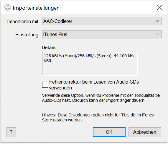 Schritt 1. Wählen Sie im iTunes-Menü Bearbeiten > Einstellungen > Importeinstellungen > AAC-Encoder unter Importieren mit und klicken Sie auf OK.