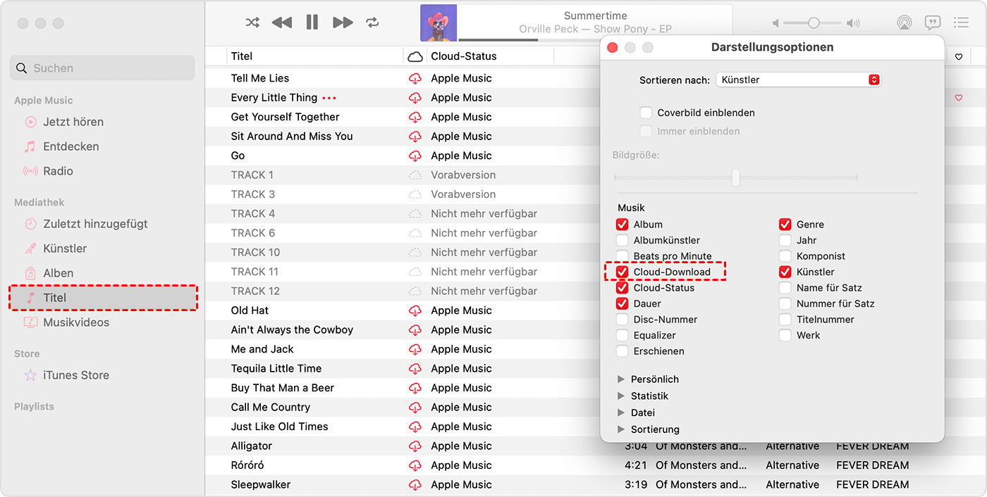 Schritt 1. Klicken Sie auf Musik > Titel > Mediathek und wählen Sie iCloud-Download oder iCloud-Status. Überprüfen Sie, welche Songs nicht berechtigt sind.