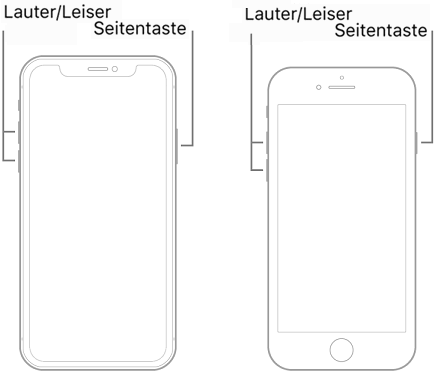 Drücken Sie kurz die Lauter-Taste und lassen Sie sie wieder los > Drücken Sie kurz die Leiser-Taste und lassen Sie sie wieder los. > Halten Sie die Seiten-/Ein-/Aus-Taste gedrückt, bis das Apple-Logo angezeigt wird.