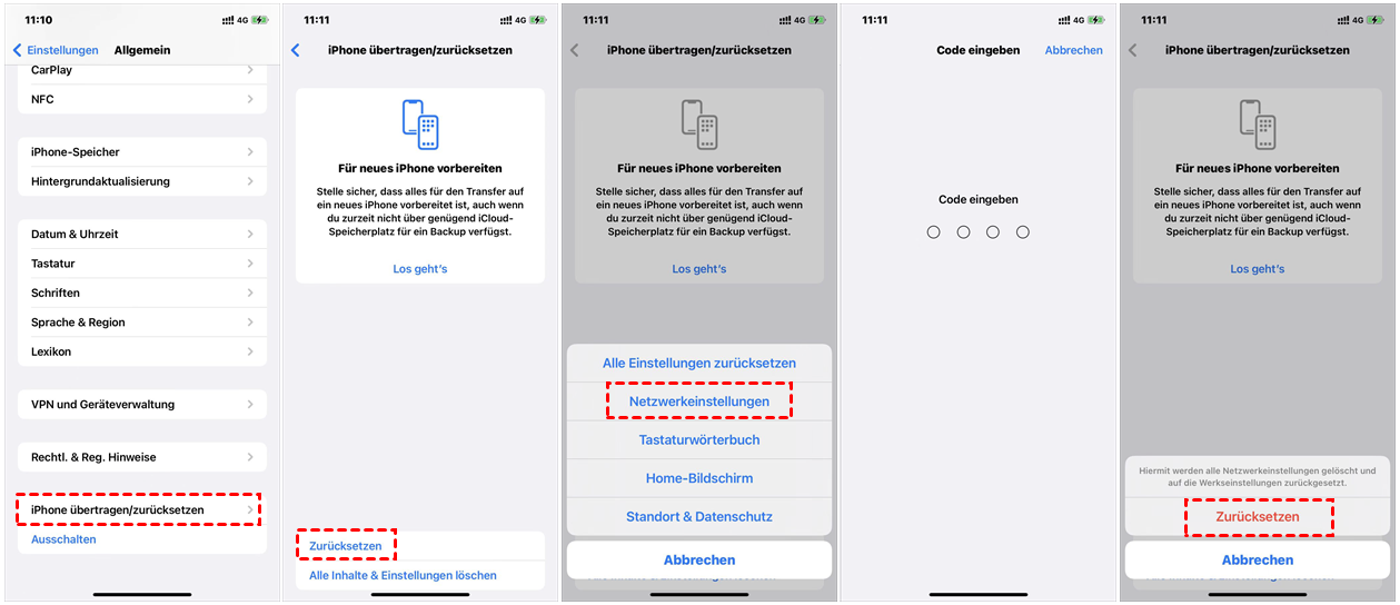 ? Um etwaige Netzwerkfehler zu beheben, gehen Sie zu „Einstellungen“ > „Allgemein“ > „iPhone übertragen/zurücksetzen“ > „Zurücksetzen“ und „Netzwerkeinstellungen zurücksetzen“. Dadurch werden Ihre WLAN-Passwörter und über Bluetooth gekoppelten Geräte gelöscht. Wenn dies erledigt ist, können Sie eine WLAN-Verbindung herstellen, um zu sehen, ob das Problem behoben wurde.