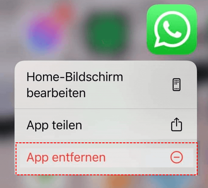 1. Tippen und halten Sie WhatsApp > Wählen Sie „App entfernen“ > „App löschen“, um WhatsApp zu deinstallieren.