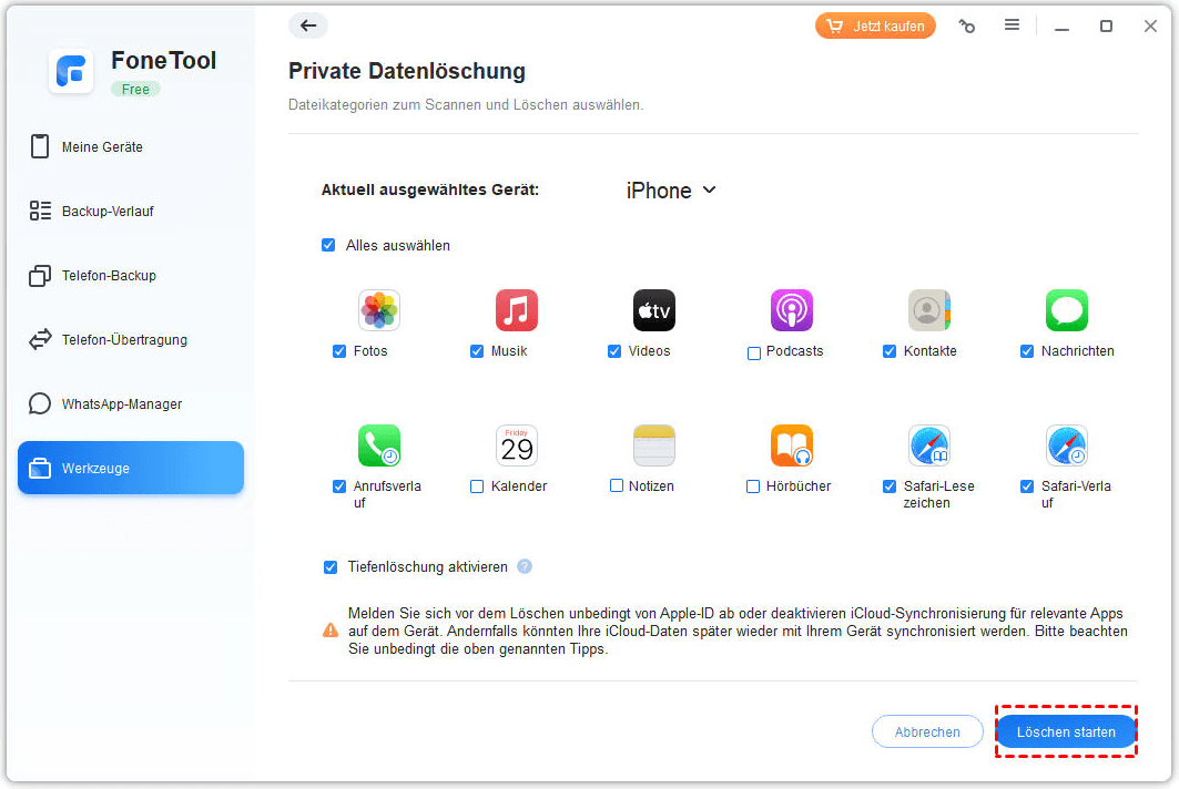 Schritt 2: Starten Sie FoneTool, klicken Sie im linken Bereich auf „Werkzeuge“ > Wählen Sie „Datenlöschung“ > Klicken Sie unter „Private Daten löschen“ auf „Starten“.